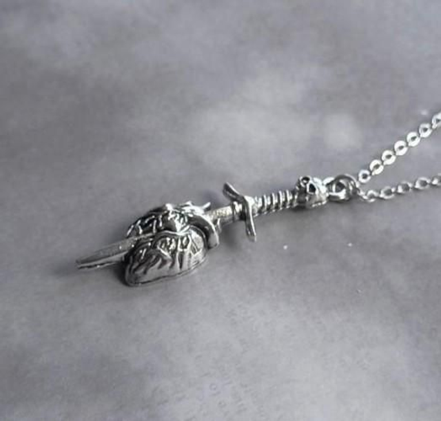 This necklace has a large metal sword piercing an anatomical heart. There is a skull on the sword handle.