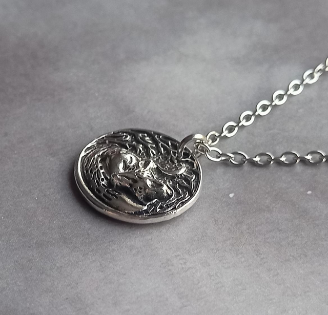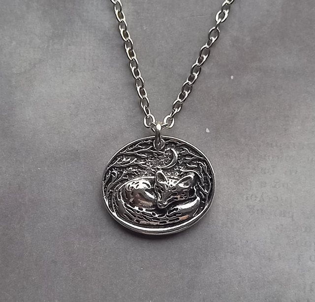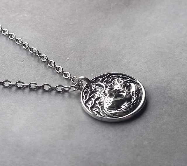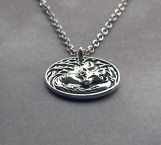 The oval is silver plated metal alloy, approximately 2cm wide and 1.75cm high. It is attached to a jumpring and hung from a stainless steel chain.