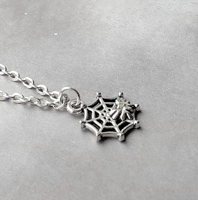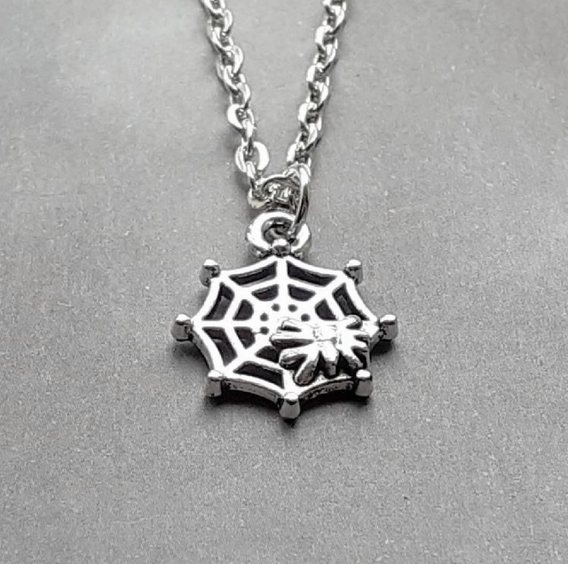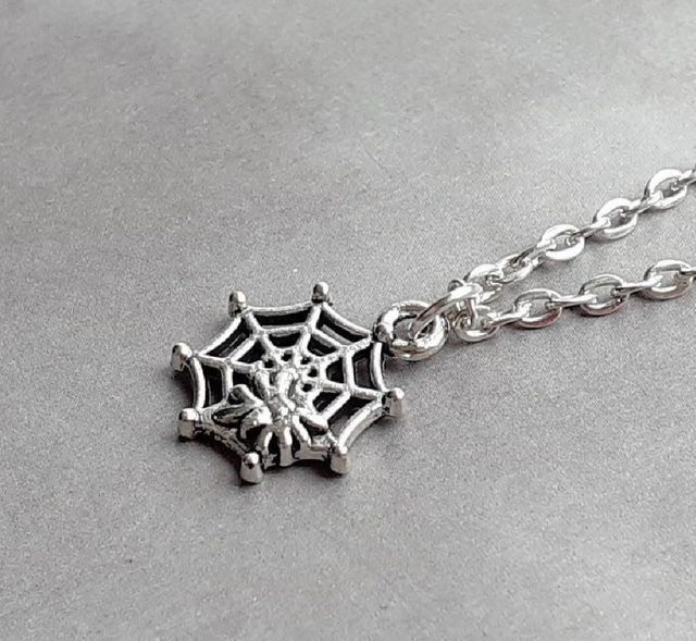 Small metal spider web necklace, complete with spider.