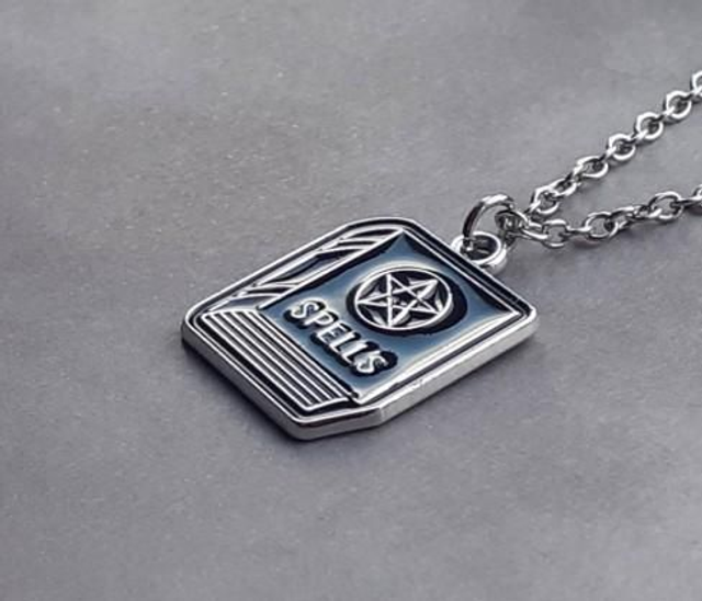 Metal spell book necklace.