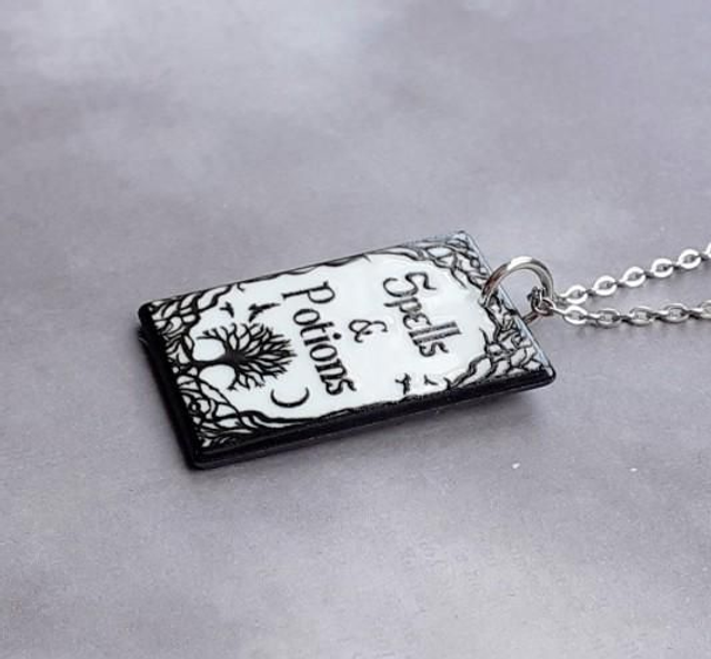 The book is made from black and white acrylic. It is approximately 2.5cm wide and 3.5cm long. It is attached to a jumpring, and hung from a stainless steel trace chain.