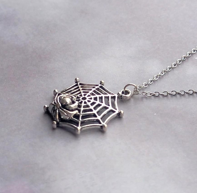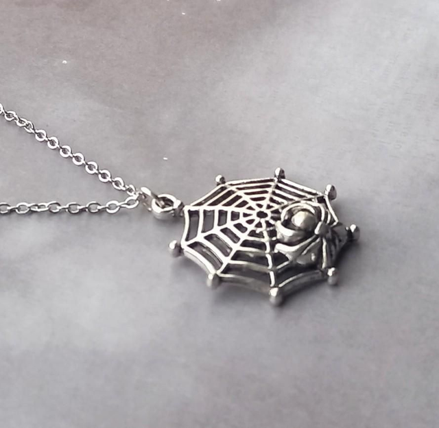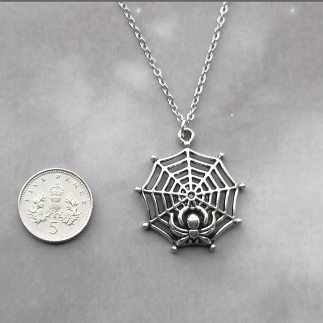 The web is silver plated metal alloy, just over 2.5cm in diameter. It is attached to a steel jumpring, and hung from a stainless steel chain.