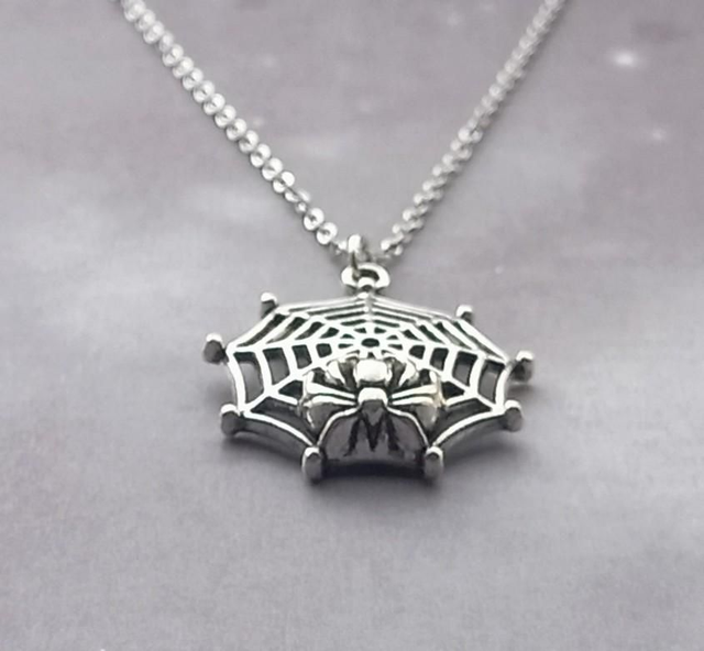 Metal spider's web necklace with spider.