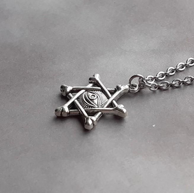 Metal Star of David necklace with a central 'all seeing eye'.