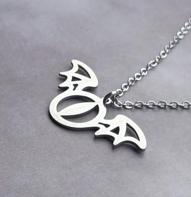 The bat is approximately 4cm wide and almost 2cm high. It is attached to a steel jumpring, and hung from a stainless steel chain. It fastens with a lobster clasp.