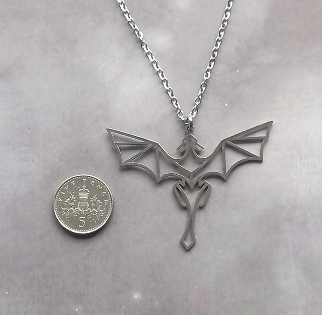 The dragon is almost 5cm wide and 4cm long. It is attached a steel jumpring, and hung from a stainless steel trace chain.