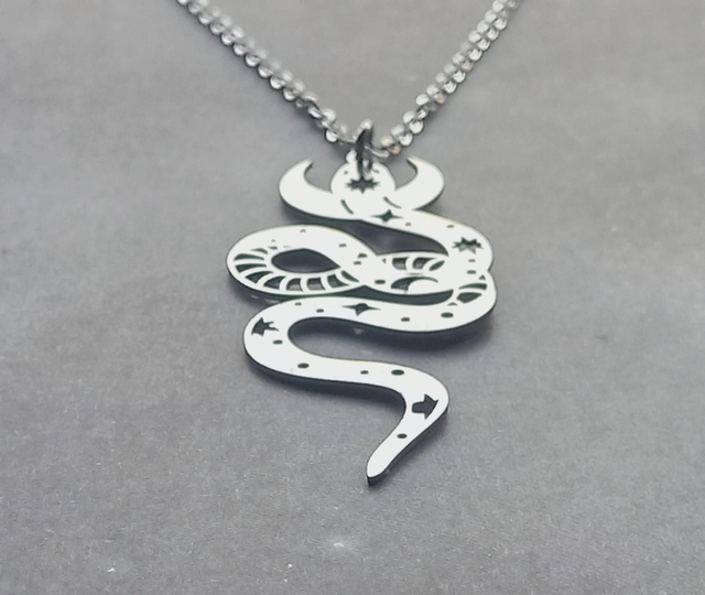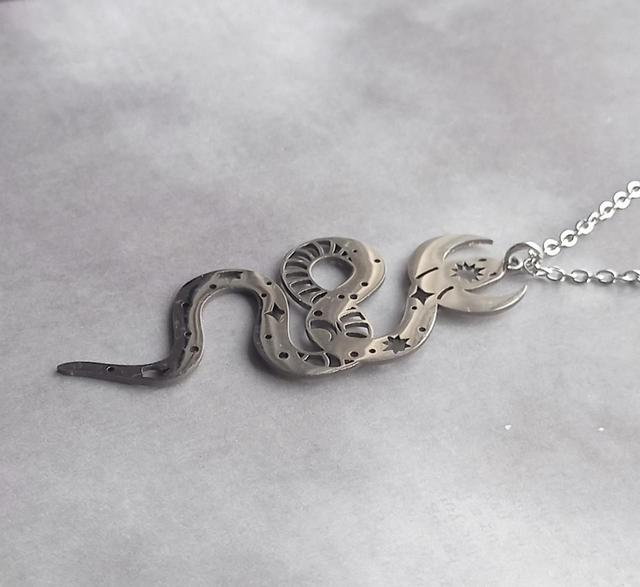 The snake is stainless steel, approximately 2.5cm wide and 6cm long. It is attached to a jumpring, and hung from a stainless steel trace chain.