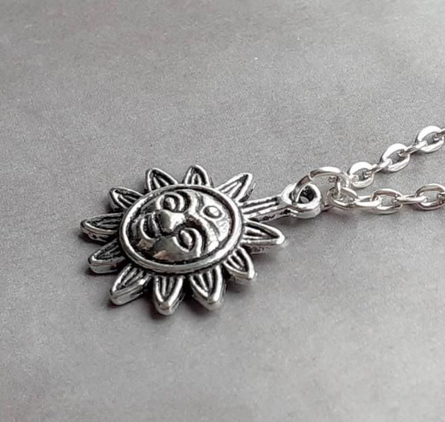 The sun is silver plated metal alloy, almost 2cm wide and 2cm high. It is attached to a steel jumpring and hung from a stainless steel chain.