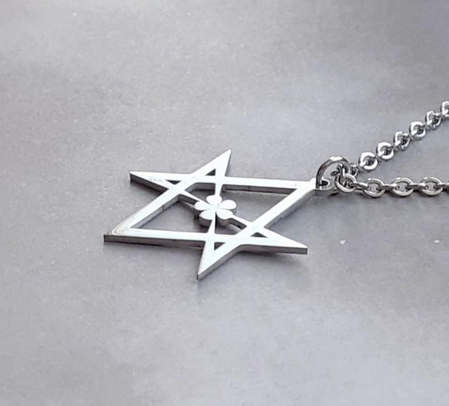 It is a unicursal hexagram - one continuous line connects all the points - with a small flower in the centre. The hexagram is almost 2.5cm wide and 3cm long. It is hung from a simple steel ring, and threaded onto a stainless steel chain.