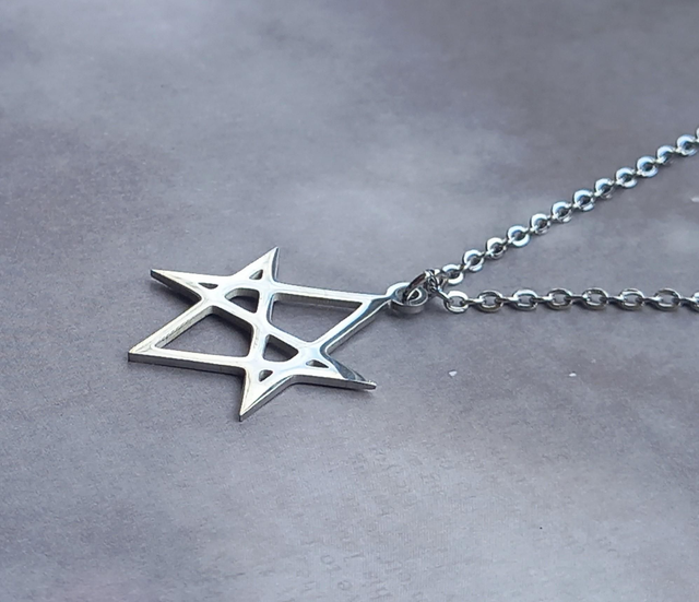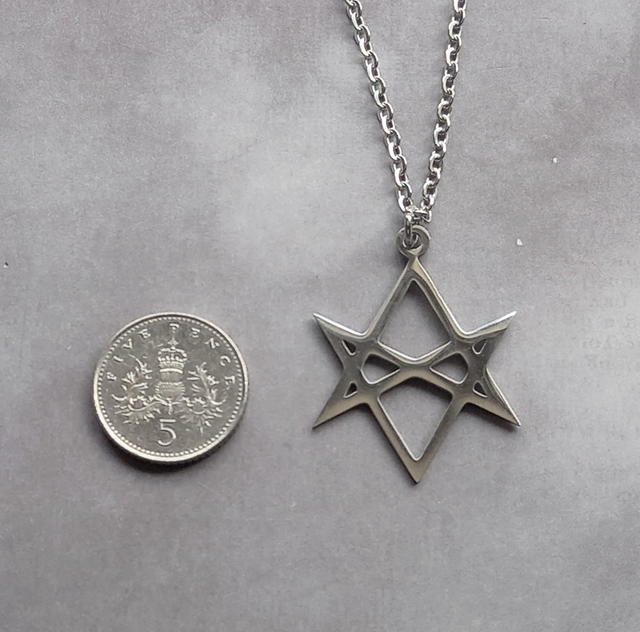 It is a unicursal hexagram - one continuous line connects all the points. The hexagram is almost 2.5cm wide and 3cm long. It is hung from a simple ring, and threaded onto a stainless steel chain.