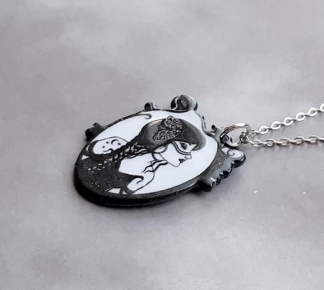 The pendant is made from black and white acrylic, and is double sided. It is approximately 3.5cm wide and 4cm high. It is attached to a jumpring, and hung from a stainless steel chain. It fastens with a lobster clasp.