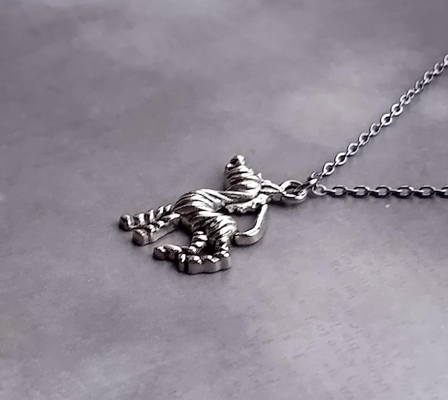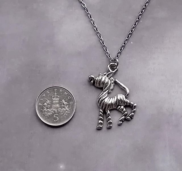 The zebra is made from silver plated metal alloy, and is approximately 2cm wide and 3cm high. It is attached to a jumpring, and hung from a steel trace chain that fastens with a lobster clasp.